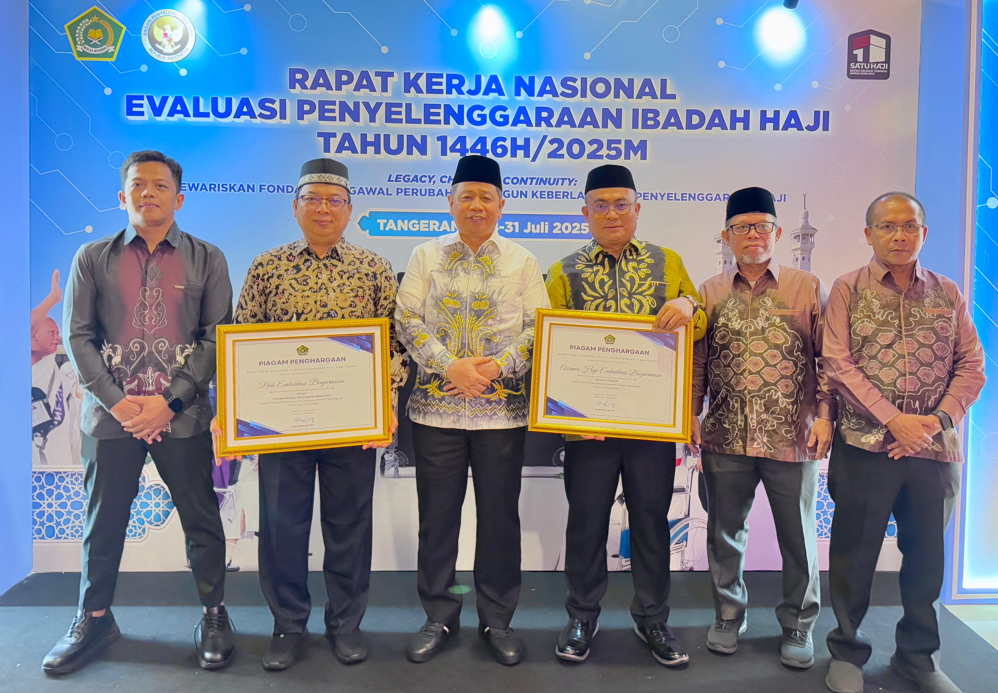 Diunggah Tanggal 29-07-2025 10:35:40 UnduhKa.Kanwil Kementerian Agama Provinsi Kalimantan Selatan Dr H Muhammmad Tambrin Didampingi Kepala Bidang Penyelenggaraan Haji Dan Umrah (PHU) Dr H Eddy Khairani, Kepala UPT Asrama Haji Embarkasi Banjarmasin Dr H Haris Fadillah Dan Para Ketua Tim Usai Menerima Penghargaan Peringkat 3 Nasional Kategori Penanganan Open Seat Di Kegiatan Rakernas Evaluasi Haji 1446 H/2025 M