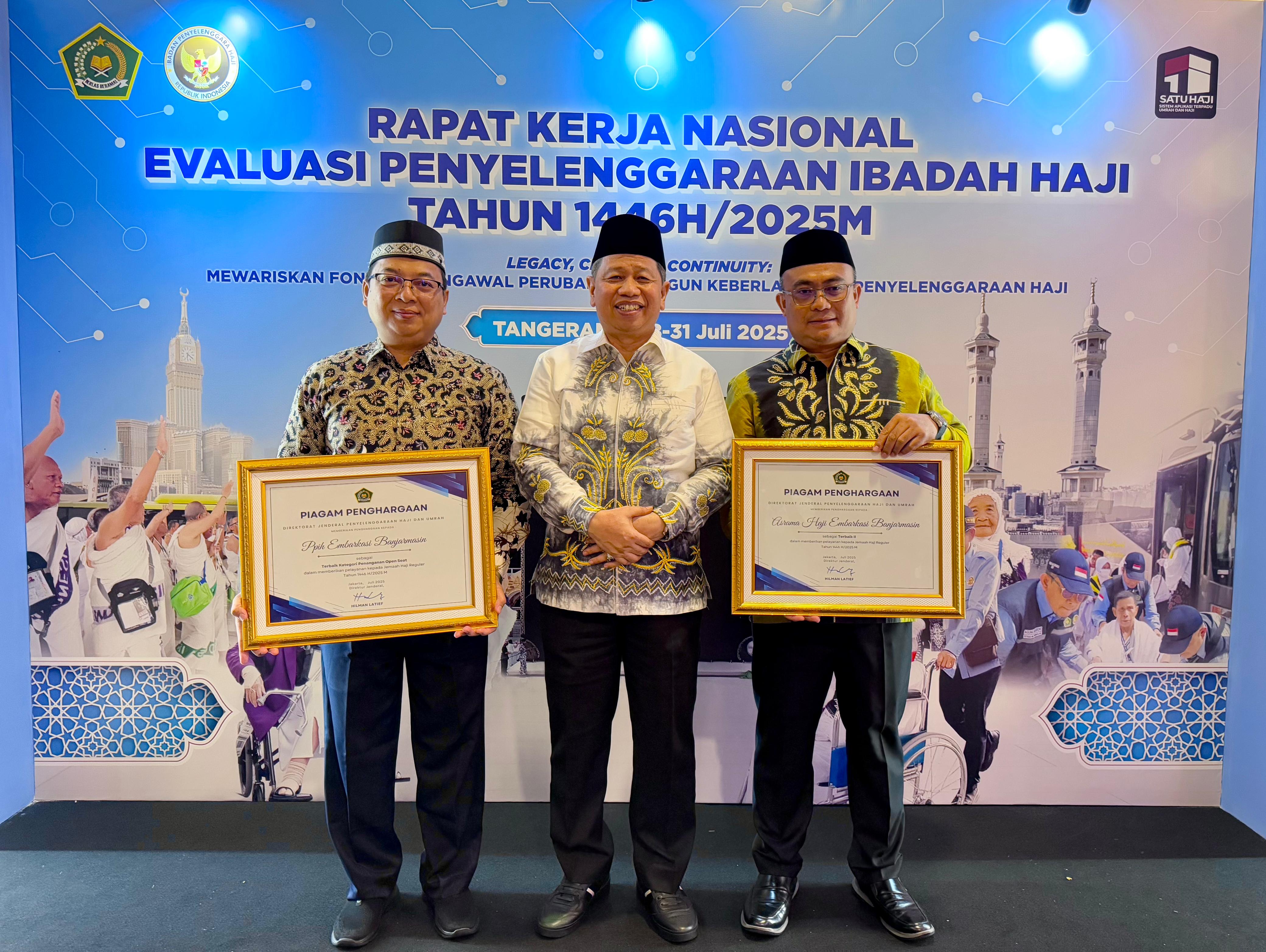 Diunggah Tanggal 29-07-2025 11:40:21 UnduhKa.Kanwil Kementerian Agama Provinsi Kalimantan Selatan Dr H Muhammmad Tambrin Didampingi Kepala Bidang Penyelenggaraan Haji Dan Umrah (PHU) Dr H Eddy Khairani Dan Kepala UPT Asrama Haji Embarkasi Banjarmasin Dr H Haris Fadillah Usai Menerima Penghargaan Peringkat 3 Nasional Kategori Penanganan Open Seat Di Kegiatan Rakernas Evaluasi Haji 1446 H/2025 M