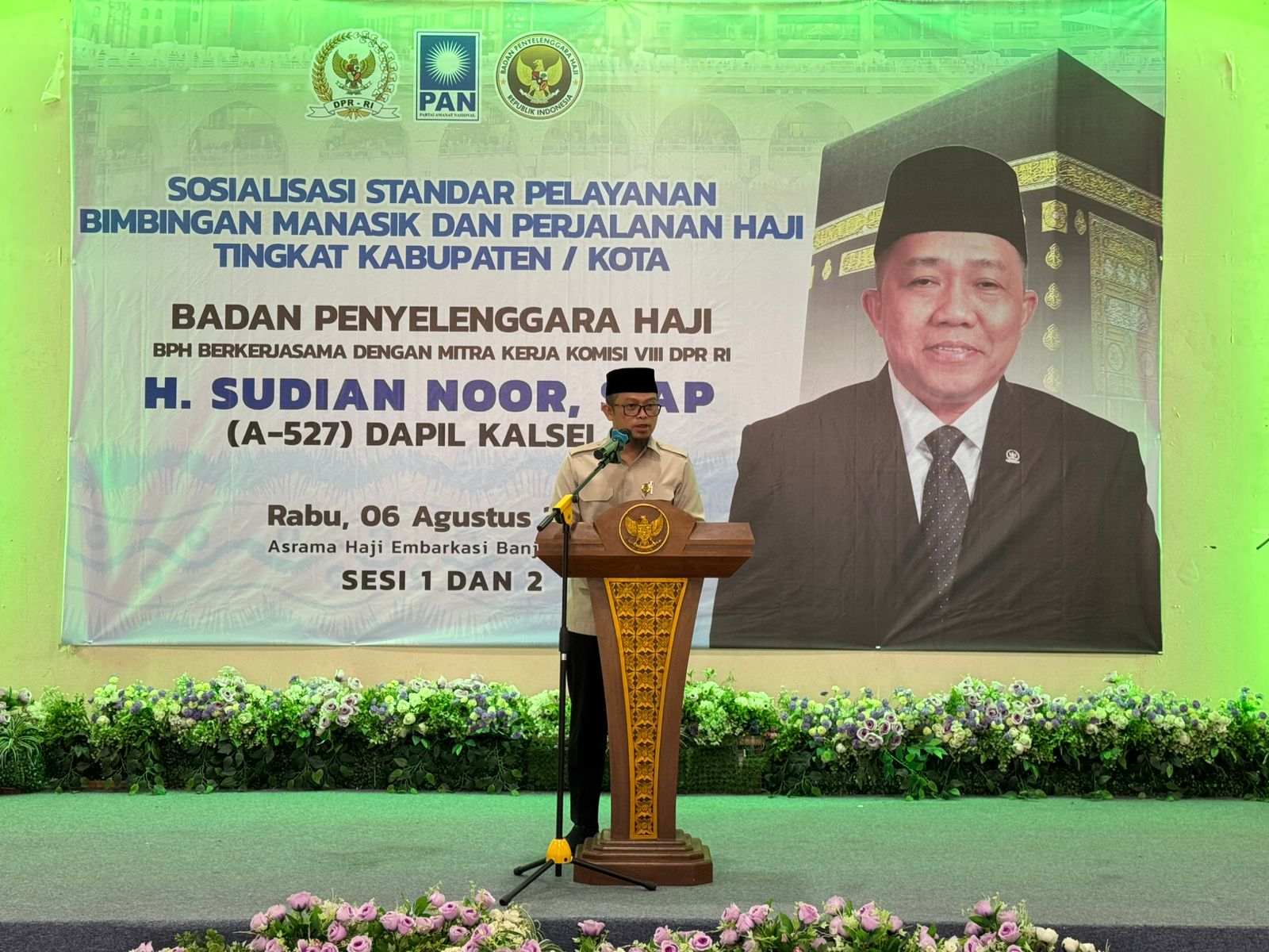 Diunggah Tanggal 07-08-2025 15:24:51 UnduhSosialisasi Standar Pelayanan Bimbingan Manasik Dan Perjalanan Haji Tingkat Kabupaten Dan Kota Se Kalimantan Selatan Bersama Badan Penyelenggara Haji (BPH) Bekerjasama Dengan Mitra Kerja DPR RI Komisi VIII H Sudian Noor, Asrama Haji Rabu, (6/8/25)